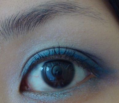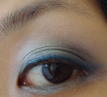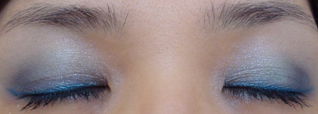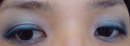 4. 用MUF黑色眼線筆化細細的上眼線,然後用細眼影刷沾雙色眼影Sea&Sky的豔麗寶藍色濕壓於眼線上為主要眼線色