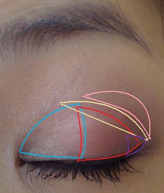 5. 淡黃色線:用淡紅酒紫色沿著紅色線上方與眉骨交界的那條線來回輕掃上色